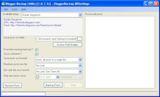 Bu adresten indireceğiniz programla blogger' da yazdığınız bütün yazılarınızı XML olarak kaydedebiliyorsunuz. Güzel bir özelliği de, blog ekleme menüsünden blogger' daki kullanıcı adı ve şifrenizi girdiğinizde bu hesaba bağlı bütün blogların kayıtlarını otomatik olarak listesine ekliyor. Kullanımı da oldukça basit, hemen kavrayacaksınız.